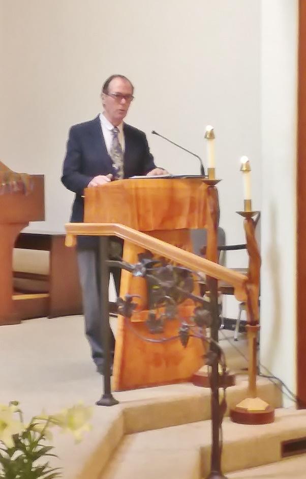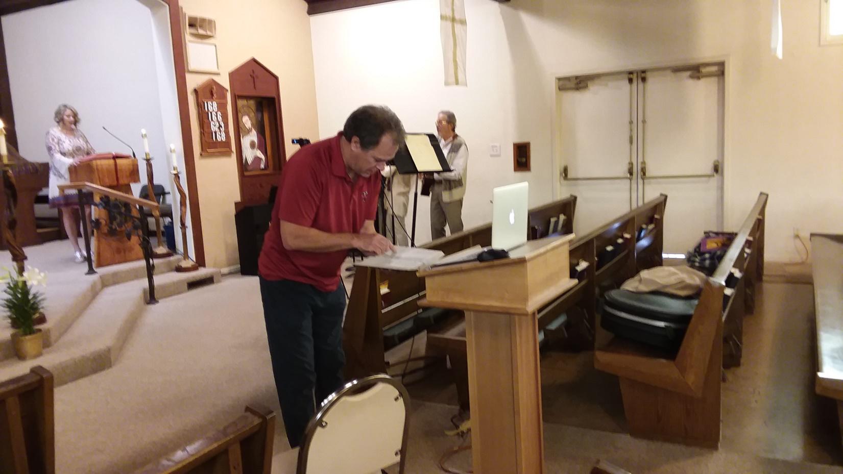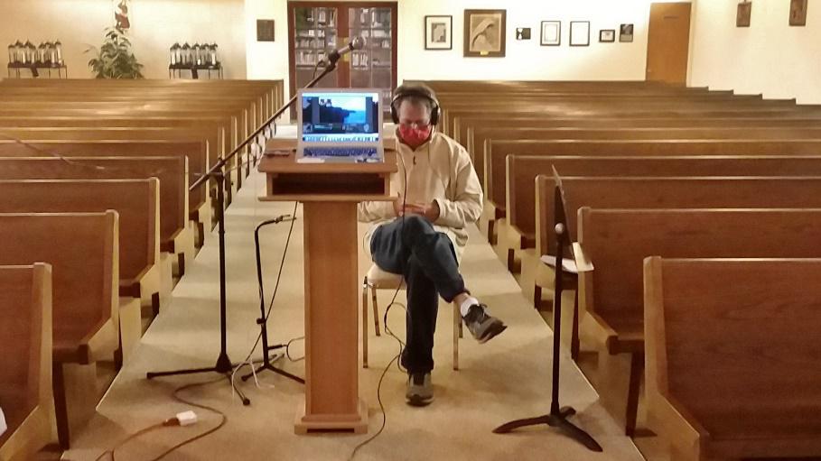 Right – Tom Cushing reads scripture to an empty church